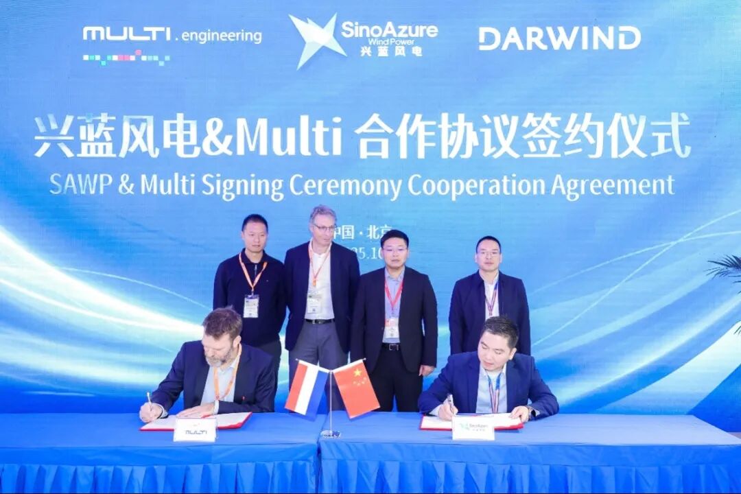 在2025年北京國際風能展覽會上,興藍風電與荷蘭Multi Engineering Group B.V.正式簽署戰略合作協議,雙方將攜手推進“雙機頭一浮體”漂浮式風電解決方案的開發與商業化。興藍風電黨委書記、董事長曹穎春出席簽約儀式。