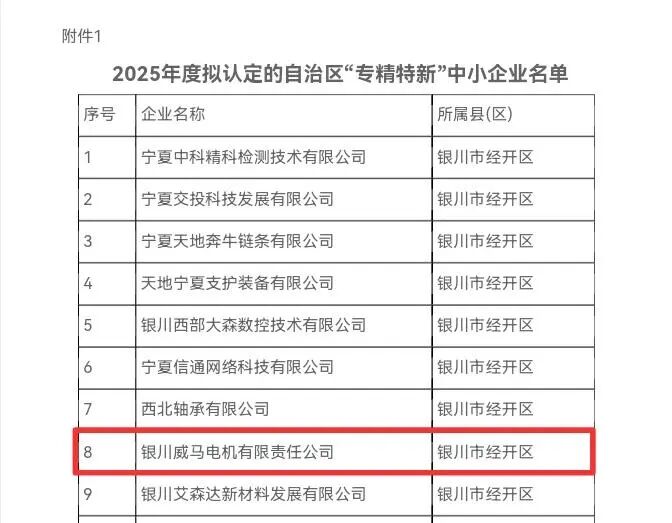 喜報 | 威力集團子公司-銀川威馬電機有限責任公司榮登2025年度自治區“專精特新”中小企業榜單