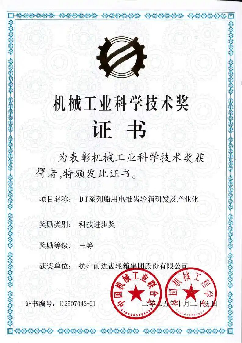 近日,杭齒集團自主研發的“DT系列船用電推齒輪箱研發及產業化”項目,憑借在綠色船舶傳動領域的技術突破與產業化成果,榮獲2025年度“機械工業科學技術獎”科技進步獎三等獎。