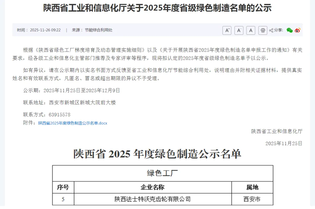 近日,陜西省工業和信息化廳正式公示2025年度省級綠色工廠名單,集團所屬陜西法士特沃克齒輪有限公司憑借突出表現成功入選。這一殊榮,標志著沃克公司綠色制造水平獲省級權威認可,實現了經濟效益與生態效益的協同共進,也是對沃克公司綠色發展成效的有力認證。