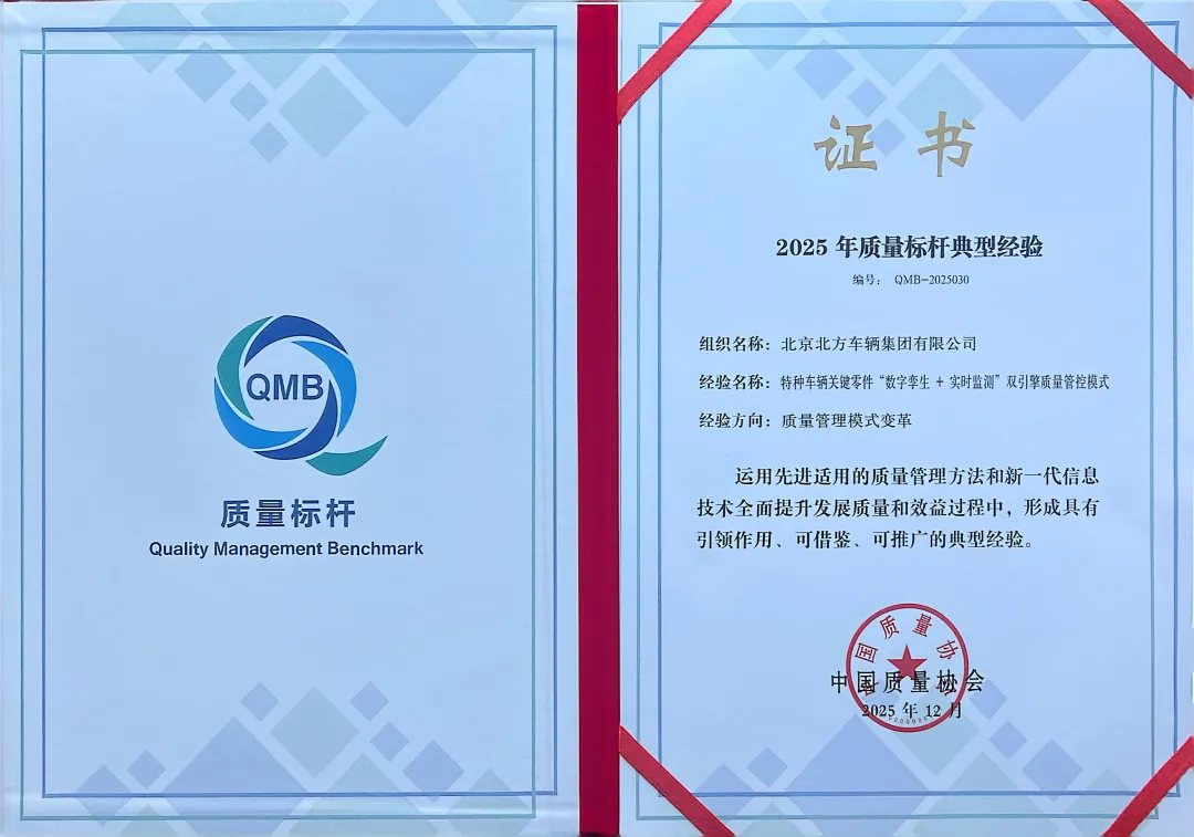 “全國質量標桿”是由工業和信息化部指導,中國質量協會組織評選的國家級質量獎項,旨在強化提升企業質量管理水平,推動培育和建設產品卓越、品牌卓著、創新領先、治理現代的世界一流企業。本年度的評選聚焦質量管理推進機制建立、質量管理數字化、質量管理模式變革、產業鏈供應鏈質量管控等方向進行遴選,經過嚴格的征選程序,全國僅74項經驗入選,公司此次獲評,標志著其在特種車輛關鍵零部件領域的質量管控能力達到國內領先水平。