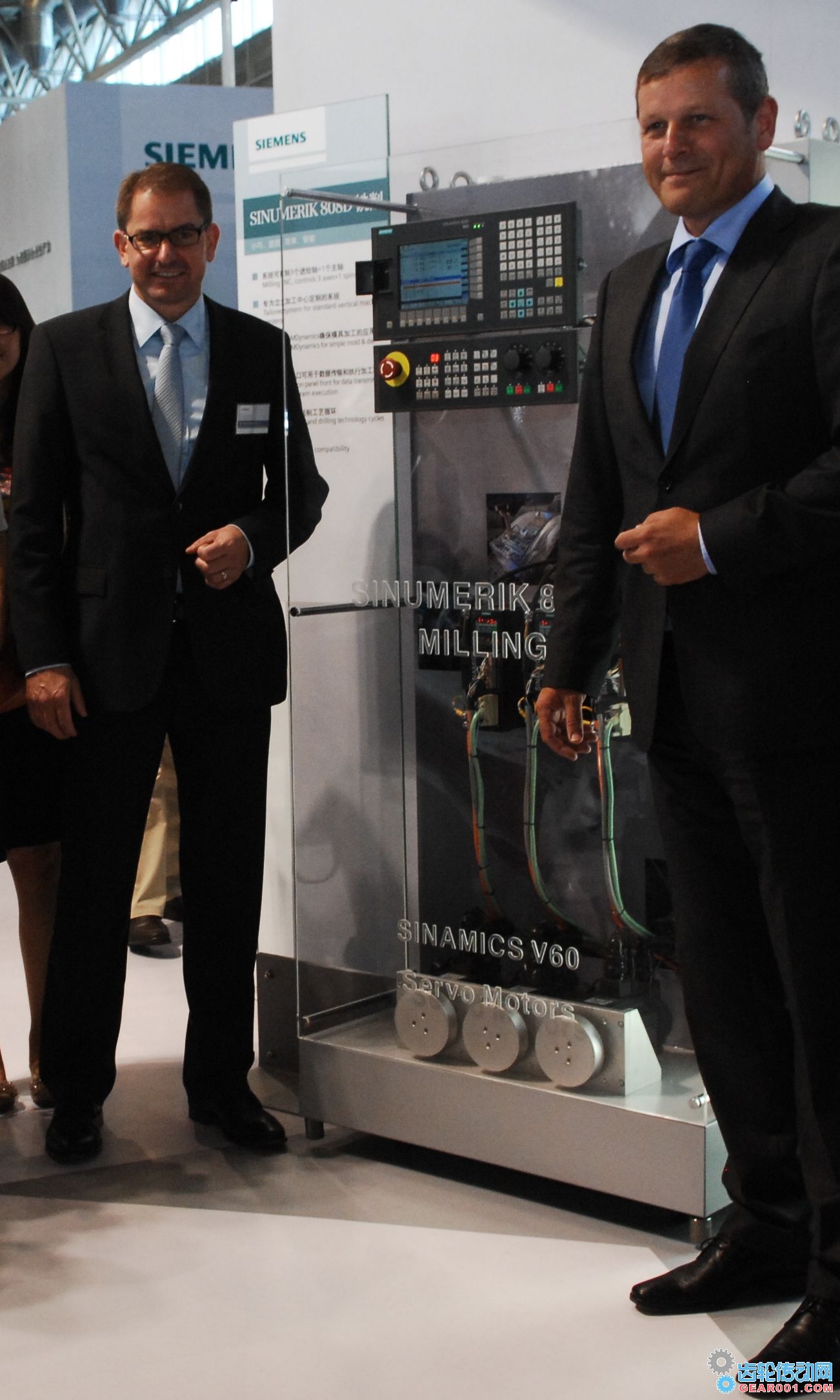 西門子公司工業(yè)業(yè)務(wù)領(lǐng)域驅(qū)動技術(shù)CEOFranke(右) 和工業(yè)業(yè)務(wù)領(lǐng)域東北亞總裁 吳和樂博士 (左) 參加CIMES并與Sinmuerik 808D合影
