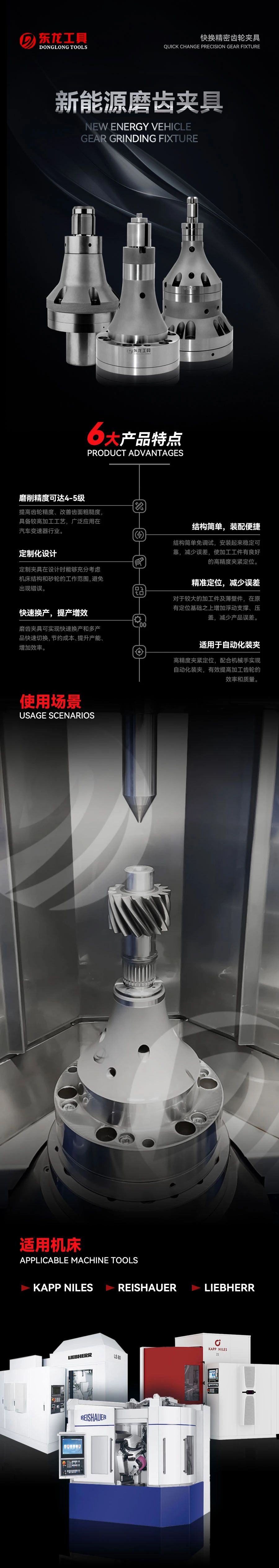 東龍設計研發的磨齒夾具,采用了定制化結構設計,確保了裝夾的便捷性與夾持的穩固性。該夾具的磨削精度可達4-5級,不僅有效改善了齒面粗糙度,還顯著提升了齒輪的加工精度。此外,它助力企業輕松實現快速換產,特別適用于自動化生產及無人化工廠環境。在實際應用中,磨齒夾具的引入使得生產效率得到了顯著提升,同時在節省人力成本方面也取得了顯著效果。
