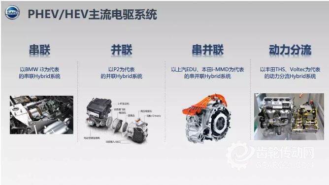 PHEV和HEV,世界主流的技術(shù)流派有四個方向。以寶馬i3為代表的串聯(lián)方案,以大眾P2為代表的并聯(lián)方案,以豐田THS系統(tǒng)為代表的動力分流方案,這個方案可能大家更熟悉一些,最后是串并聯(lián)方案。我們在混動車型的幾條路線中,選擇了串并聯(lián)的方案。