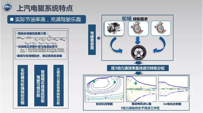 我們創(chuàng)新了輪端扭矩需求解析。將駕駛員踏板的意圖,直接轉(zhuǎn)換為輪端扭矩,再將扭矩命令,通過三動力源的效率特性進行智能分配。在確保駕駛性的同時,提高了經(jīng)濟性。同時這套系統(tǒng)會對駕駛者的意圖進行不斷地學(xué)習(xí),確保動力源的響應(yīng)能夠契合駕駛員最真實的意圖。又由于電機的響應(yīng)特性,整套系統(tǒng)的駕駛性比傳統(tǒng)發(fā)動機汽車更直接。