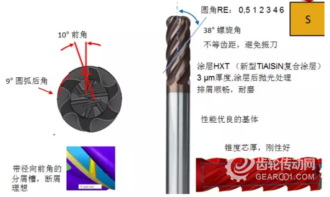 38度的螺旋角度配合10度的切削前角,對于鈦合金等難加工材料的切削加工非常有利,切削刃口能夠順利切入材料并卷屑成型,鐵屑能夠順利從排屑槽迅速排出,9度圓弧后角在提供強壯刃口的同時,保證了刃口的鋒利程度。