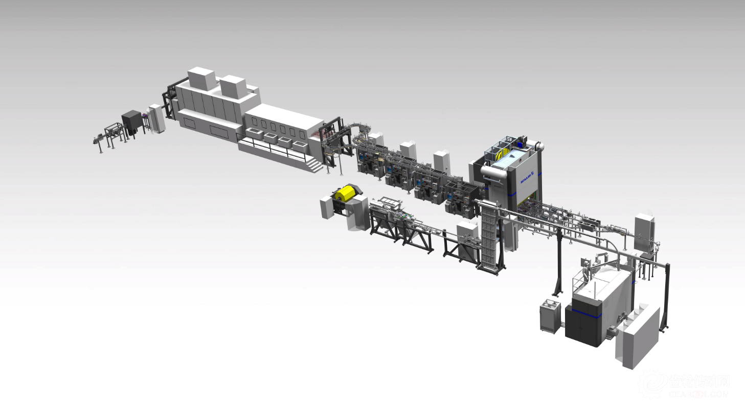 s 圖9: 生產(chǎn)線由沖擊擠壓機(jī)(右下)、精沖整形壓力機(jī)、切邊機(jī)、清洗裝置和烘干裝置組成。
