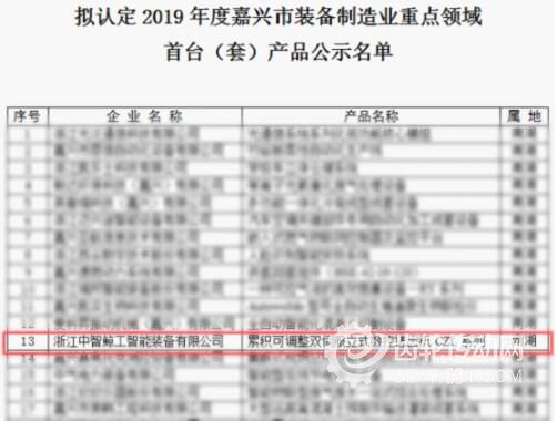 擬認定2019年度嘉興市裝備制造業重點領域首臺(套)產品公示名單(節選)