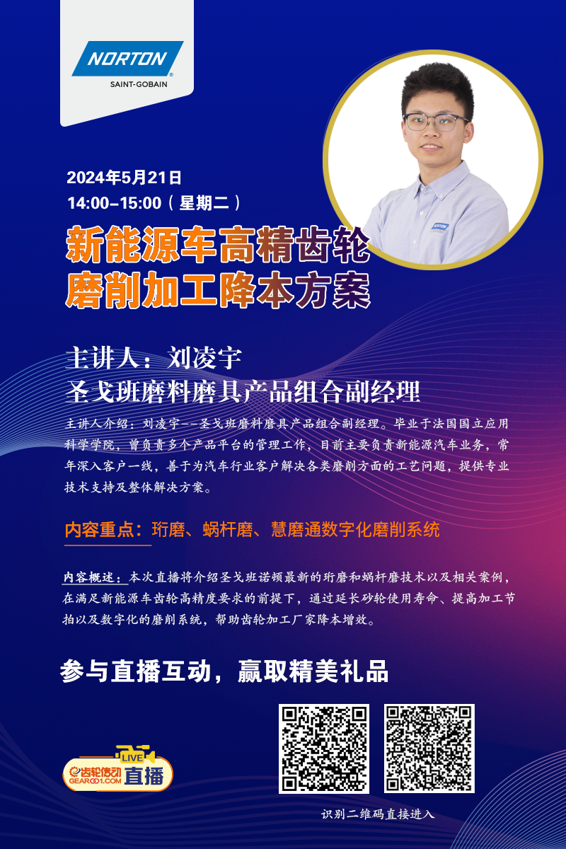 本次直播將介紹圣戈班諾頓最新的珩磨和蝸桿磨技術以及相關案例,在滿足新能源車齒輪高精度要求的前提下,通過延長砂輪使用壽命、提高加工節拍以及數字化的磨削系統,幫助齒輪加工廠家降本增效。
