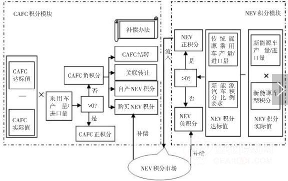 圖 1 為雙積分考核流程。從圖 1 可看出,該管理辦法可分為 CAFC 積分和 NEV 積分兩個(gè)主要模塊,兩大模塊又通過新能源積分市場產(chǎn)生相互關(guān)聯(lián)。CAFC 積分不達(dá)標(biāo)的企業(yè)可從新能源積分市場購買 NEV 積分來補(bǔ)償自身的 CAFC 負(fù)積分,而有 NEV 盈余的企業(yè)則可出售 NEV 積分來獲利[4]。