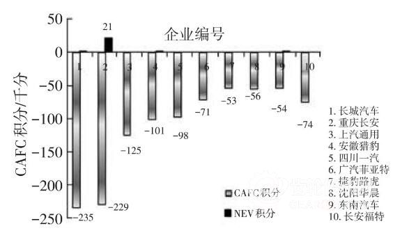 選取 CAFC 負(fù)積分最多的 10 家未達(dá)標(biāo)企業(yè)(圖 5)分析發(fā)現(xiàn),首先,未達(dá)標(biāo)企業(yè)以 SUV 車型為主,因車型結(jié)構(gòu)不合理使得其 CAFC 負(fù)積分偏高;其次,未達(dá)標(biāo)企業(yè)在新能源汽車領(lǐng)域少有業(yè)績,除少數(shù)企業(yè)獲得 NEV 積分外,其余車企 NEV 積分為零,無法借助 NEV 積分抵消 CAFC 負(fù)積分。對于部分未達(dá)標(biāo)企業(yè)可以利用集團(tuán)內(nèi)部在關(guān)聯(lián)企業(yè)間積分轉(zhuǎn)讓、交易的方式進(jìn)行負(fù)積分抵償。一些獨(dú)立企業(yè)如長城汽車必須調(diào)整產(chǎn)品計(jì)劃,使預(yù)期產(chǎn)生的正積分能夠抵償其負(fù)積分。