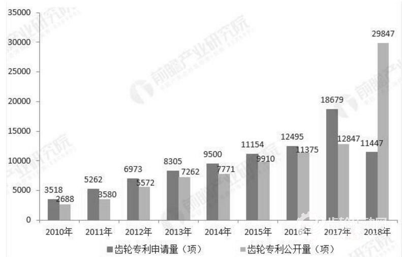 齒輪行業的發展離不開行業相關技術的支撐,同時技術專利的數量也可以在一定程度上反應行業發展情況。我國近年來推進制造業轉型升級,加快打造“中國制造”和“中國智造”,推動了我國齒輪行業技術的快速發展。從我國齒輪行業專利申請數量和專利公開數量來看,2011-2017年,我國齒輪行業專利量實現了快速增長。2017年,我國齒輪行業專利申請量和專利公開量分別達到18679項和12847項,較2016年均有明顯提高。截至2018年12月17日,我國齒輪行業專利申請數量為11447項,而專利公開數量達到29847項,是2017年全年數量的2.32倍。