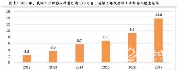 根據工控網數據,2017年,中國工業機器人銷量增至13.8萬臺,連續五年成為全球工業機器人銷量冠軍。