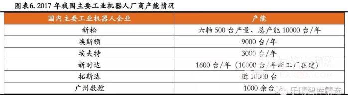 2017年,我國主要的工業機器人生產廠商為新松、埃斯頓、埃夫特、新時達、拓斯達、廣州數控等企業;其中新松、埃斯頓、拓斯達工業機器人年產量均超過9000臺,新時達有一個年產能為10000臺的新工廠在建。
