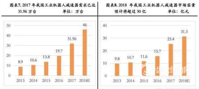據高工產研機器人研究所數據顯示,2017年中國工業機器人減速器新增需求量達31.96萬臺,同比增速超62.23%;預計2018年中國工業機器人減速器需求將超過40萬臺,市場容量將超過30億元。