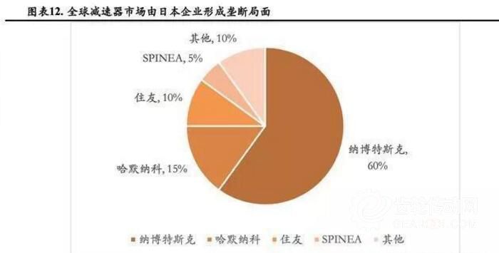 根據工控網披露的數據,2015年全球精密減速器市場大部分市場份額被日本的三家企業所占有,其中納博特斯克生產的減速器,約占60%的份額,哈默納科生產的減速器,約占15%的份額,住友生產的減速器,約占10%的份額。