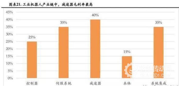 上游核心零部件在工業機器人產業鏈中毛利率較高。其中減速器部分毛利率最高,未來降價空間最大,伯朗特等國產工業機器人價格存在進一步下降的可能性。