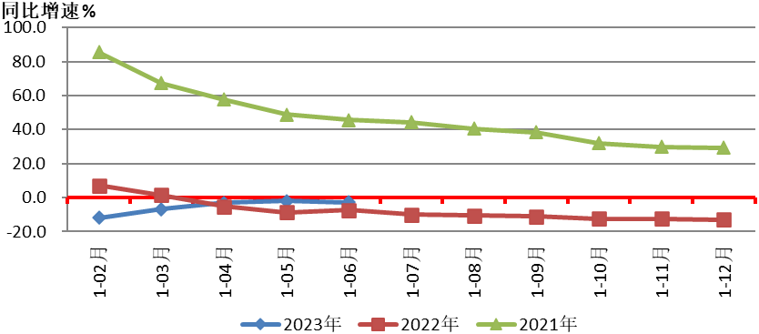 圖1是2023年1-6月和2022年、2021年重點聯系企業營業收入同比增速情況的對比。