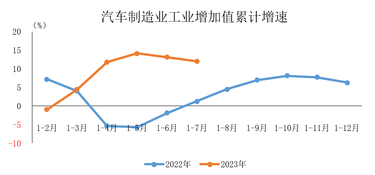2023年1-7月,汽車制造業(yè)工業(yè)增加值同比增長12.0%,高于同期規(guī)模以上工業(yè)8.2個(gè)百分點(diǎn)。