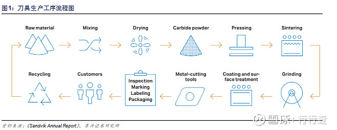 刀具生產普遍采用通用生產線,生產工序從前到后依次為配料——壓制成型——燒結成型——深加工——涂層——包裝等環節,國際一線廠商還會參與廢舊刀片回收環節,在控制原材料市場價格的同時實現與客戶的深度綁定,其中山特維克在過去十年間回收的硬質合金刀片數量已經占到銷售量的40%。
