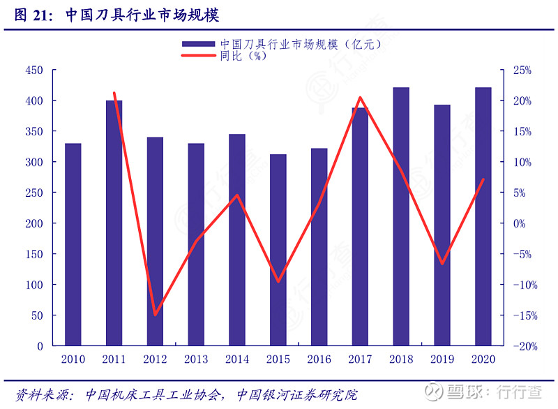 機床刀具為典型的工業耗材,全球市場規模在2000億級別,每年穩定增長,中國市場規模在400億級別,與制造業發展密切相關。2016-2018年我國切削刀具市場規模出現明顯快速增長,2018年刀具消費總額達到421億元,為歷史最高點。2019年受中美貿易摩擦加劇、汽車等下游行業持續下行的影響,我國刀具消費額有所下滑。2021年,隨著制造業的快速復蘇和下游需求的增長,市場規模有望延續2020年的量價齊升趨勢。