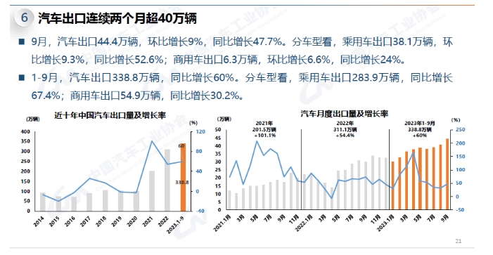 9月,汽車產銷分別達到285萬輛和285.8萬輛,環比均增長10.7%,同比分別增長6.6%和9.5%,產銷量均創歷史同期新高。1-9月,汽車產銷累計完成2107.5萬輛和2106.9萬輛,同比分別增長7.3%和8.2%。預計伴隨各項促消費、穩增長政策持續落地,效應不斷累積,將對四季度汽車市場形成有力支撐,有助于實現全年穩增長目標。