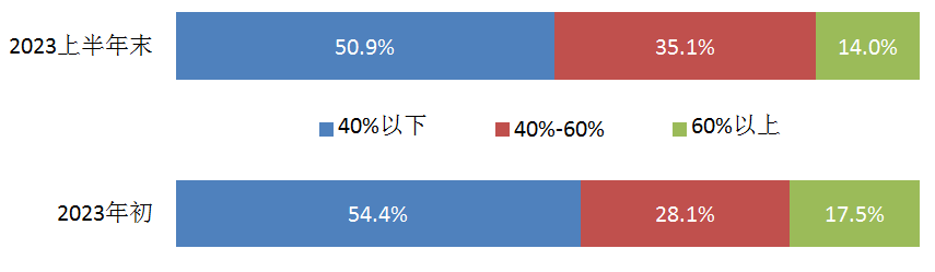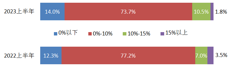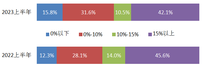 從利潤率的分布看,2023年上半年利潤率在0%以下的占15.8%,占比上升3.5個百分點;位于0%-10%之間的占31.6%,占比上升3.5個百分點;位于10%-15%之間的占10.5%,占比下降3.5個百分點;位于15%以上的占42.1%,占比下降3.5個百分點。整體分布明顯往左側集中。利潤率的整體分布情況見圖2。