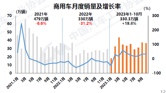 1-10月,商用車產銷累計完成328.6萬輛和330.3萬輛,同比分別增長22.1%和19.8%。在商用車主要品種中,與上年同期相比,客車、貨車產銷均呈兩位數較快增長。