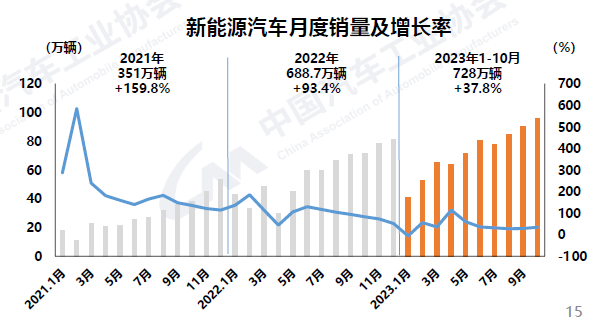 1-10月,新能源汽車產銷累計完成735.2萬輛和728萬輛,同比分別增長33.9%和37.8%,市場占有率達到30.4%。