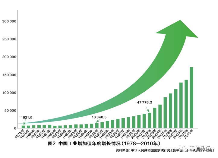 1979 年 11 月,鄧小平會見美國不列顛百科全書出版公司副總裁弗蘭克·吉布尼等人時,提出了“社會主義也可以搞市場經(jīng)濟”的著名論斷,為社會主義建設找到新的活力之源指明了方向。從 20 世紀 80 年代中國引入市場經(jīng)濟概念到 90 年代確立市場經(jīng)濟體制,中國工業(yè)擺脫了計劃經(jīng)濟的束縛,走向市場,并逐步建立起包括生產(chǎn)資料市場、資金市場、勞動力市場、技術市場、企業(yè)產(chǎn)權市場等生產(chǎn)要素的市場體系,形成了國有經(jīng)濟與民營經(jīng)濟共同發(fā)展、相互補充的多元化工業(yè)經(jīng)濟格局。特別是 2001 年正式加入 WTO 之后,隨著制造業(yè)融入全球產(chǎn)業(yè)鏈,中國昂首邁進世界工業(yè)大國行列。中國長期鍥而不舍地執(zhí)著于推進工業(yè)化,終于在改革開放的和煦春風中找到了一條適合自身國情的快行道。