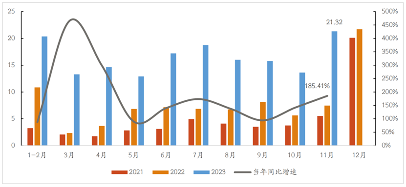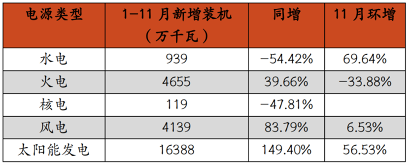 在全國能源會議的前一天,國家能源局發布1-11月份全國電力工業統計數據。截至11月底,全國累計發電裝機容量約28.5億千瓦,其中,太陽能發電裝機容量約5.6億千瓦,同比增長49.9%;風電裝機容量約4.1億千瓦,同比增長17.6%。從新增裝機容量來看,新增風電發電裝機容量為4139萬千瓦,同比增長83.79%;新增太陽能發電裝機容量為16388萬千瓦,同比增長更是高達149.4%。二者合計20527萬千瓦,即2.05億千瓦。