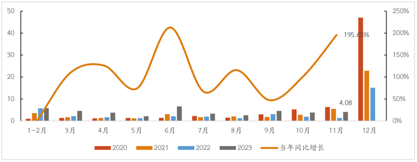 根據近幾年的歷史經驗,臨近年底,風電、光伏行業均存在搶裝潮現象,12月新增裝機量大概率會繼續沖量。因此,據行業協會和券商研究預測,2023年,全國風電、光伏新增裝機規?;驅⑦_到2.3億-2.6億千瓦。