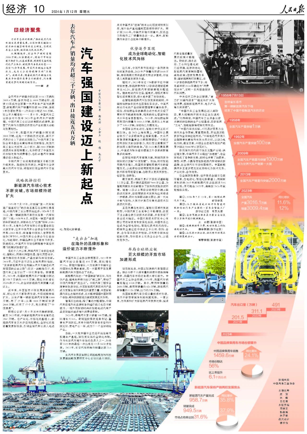 ”從蹣跚起步,到去年產銷均首超3000萬輛;從依賴進口,到海外市場份額不斷擴大;從基礎薄弱,到擁有完備的現代化產業體系、新能源汽車亮點紛呈……歷經70余年發展,中國汽車制造業逐步壯大,成為工業經濟穩增長的“壓艙石”。放眼未來,隨著我國汽車制造業發展水平和國際競爭力不斷提升,汽車強國建設步伐將越邁越堅實。——編 者