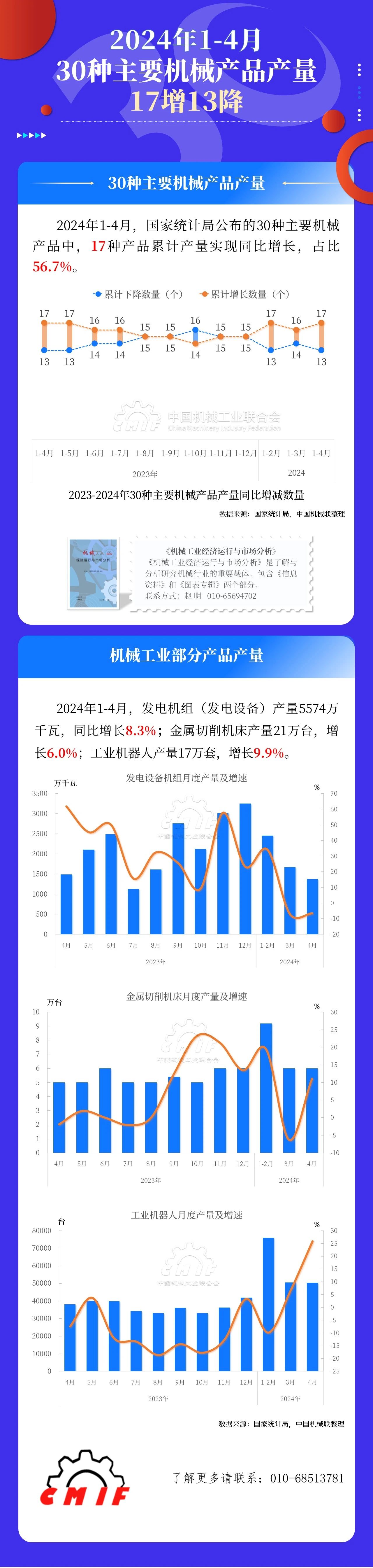 2024年1-4月,國(guó)家統(tǒng)計(jì)局公布的30種主要機(jī)械產(chǎn)品中,17種產(chǎn)品累計(jì)產(chǎn)量實(shí)現(xiàn)同比增長(zhǎng),占比56.7%。