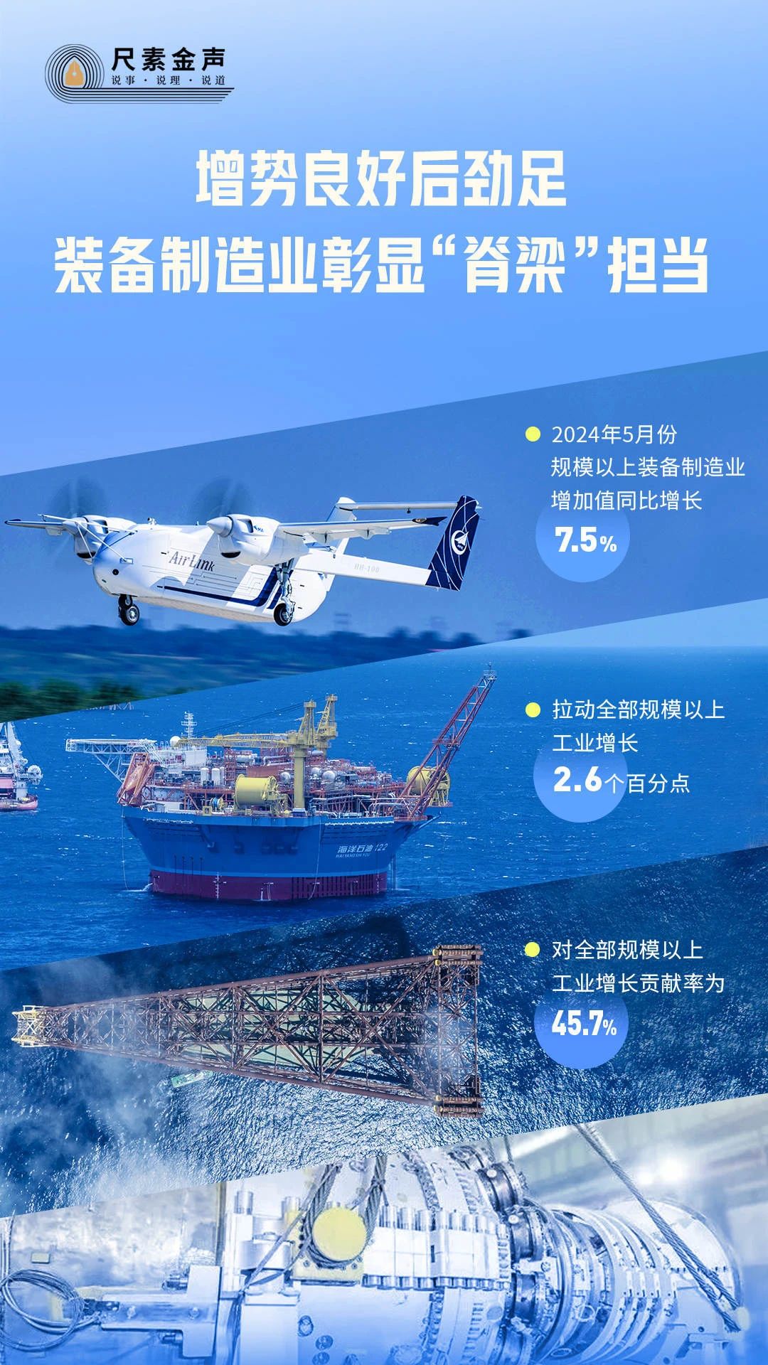 塊頭更大了。5月份,規模以上裝備制造業增加值同比增長7.5%,拉動全部規模以上工業增長2.6個百分點,對全部規模以上工業增長貢獻率為45.7%,有力發揮“壓艙石”作用。其中,計算機通信和其他電子設備制造業增長14.5%,鐵路船舶航空航天和其他運輸設備制造業增長11.8%,均保持兩位數增長。