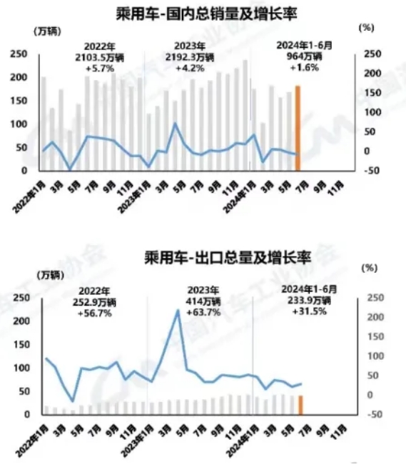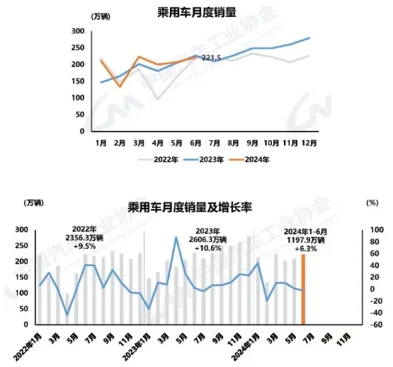 6月,乘用車國內銷量181.2萬輛,環比增長8%,同比下降7.4%;乘用車出口40.3萬輛,環比增長1.4%,同比增長29.1%。其中,傳統燃油乘用車國內銷量89.3萬輛,比上年同期減少37.1萬輛,環比增長3.5%,同比下降29.3%。1-6月,乘用車國內銷量964萬輛,同比增長1.6%;乘用車出口233.9萬輛,同比增長31.5%。
