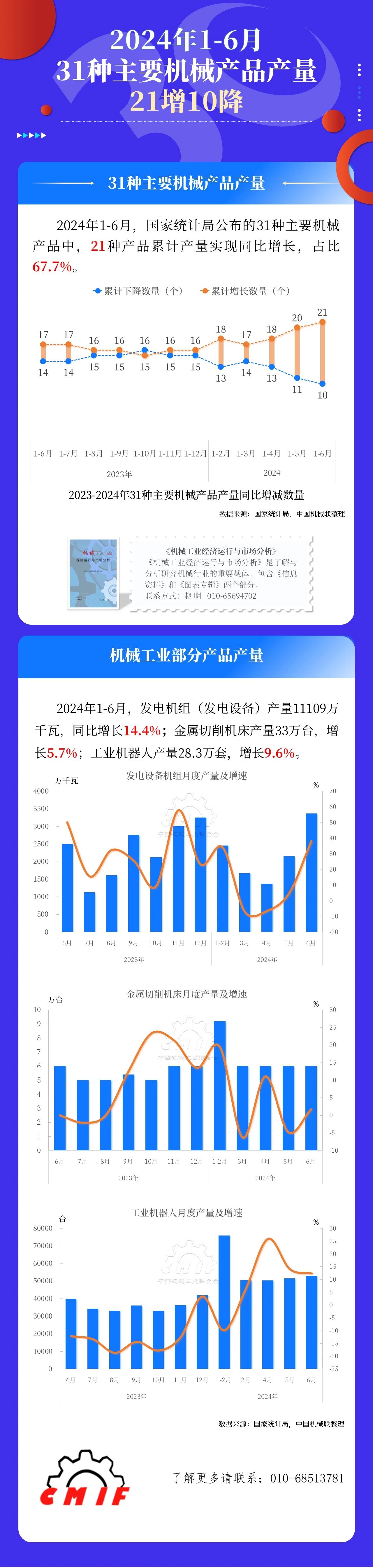 2024年1-6月,國家統計局公布的31種主要機械產品中,21種產品累計產量實現同比增長,占比67.7%。
