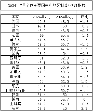 2024年7月份,歐洲制造業PMI為47.9%,較上月微幅下降0.1個百分點,連續2個月環比下降。從主要國家來看,俄羅斯制造業PMI較上月下降,但仍保持在53%以上;英國制造業PMI較上月上升,升至52%以上;德國和法國制造業PMI較上月均有不同程度下降,且均在45%以下。