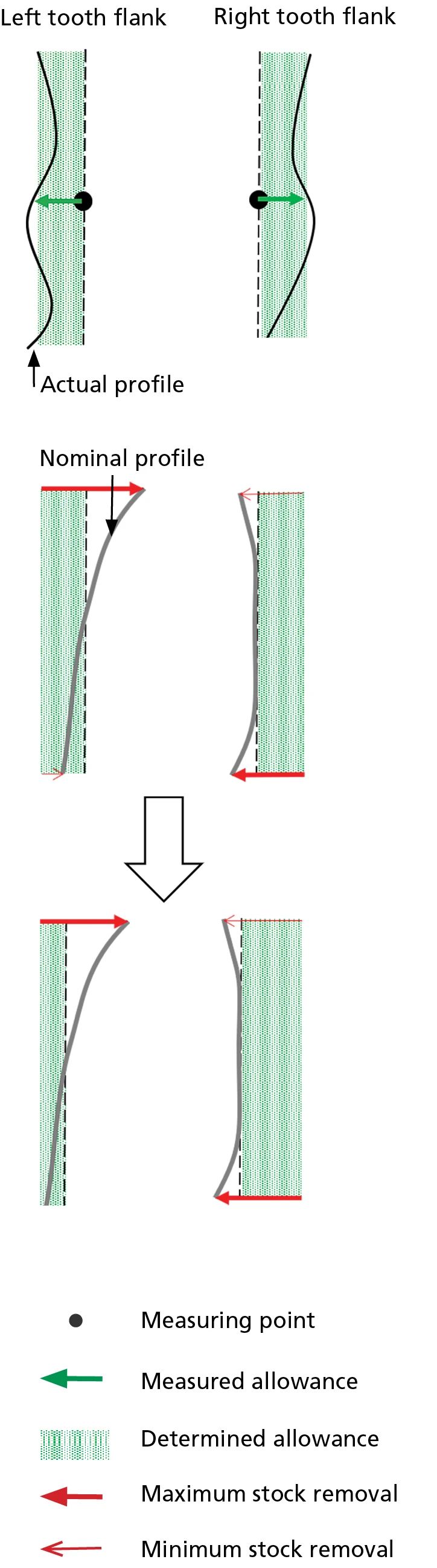 圖4以單齒為示例顯示了原理。未修形的名義齒形是判斷余量的起始點(diǎn)。余量即測(cè)量期間的測(cè)量位置和未修形的齒形位置之間的差異。