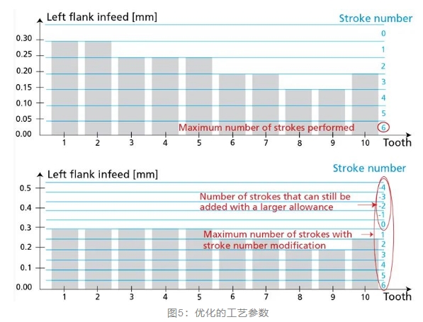 只要余量評(píng)估越可靠,就越可能得到最大的去除量,可使用不同沖程次數(shù)自動(dòng)確定每個(gè)齒槽磨削所需的走刀數(shù)。這避免了不必要的走刀,以及超出進(jìn)刀量限制的材料去除。因?yàn)閷?duì)于余量大的齒槽會(huì)自動(dòng)增加走刀次數(shù)。