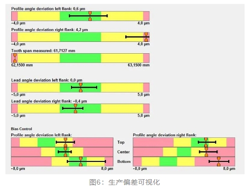 本質(zhì)上來(lái)說(shuō),測(cè)量結(jié)果是來(lái)自磨齒機(jī)的在線檢測(cè)系統(tǒng),還是來(lái)自齒輪測(cè)量中心并不重要。這兩種情況中,如果需要進(jìn)行修正,操作者在加工下個(gè)工件前就會(huì)收到通知(見(jiàn)圖6)。會(huì)通過(guò)交通信號(hào)燈的顏色顯示(綠色、黃色和紅色)來(lái)展示各項(xiàng)偏差,含義非常明確。