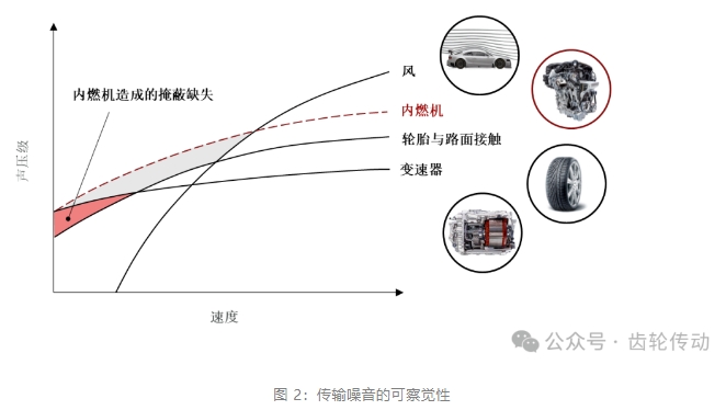 請注意,變速器的噪音之前是如何被內(nèi)燃機的聲音所掩蓋的。發(fā)動機聲音消失后,變速器的聲音就會顯現(xiàn)出來。一旦達到一定速度,輪胎與路面接觸的聲音就會占據(jù)主導地位,從而掩蓋了變速器的聲音。