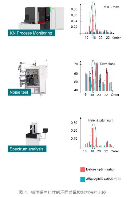 隨后的分析表明,接觸式頻譜分析和嚙合式測試均顯示異常齒輪的第 18 階存在異常。通過Kapp Niles的方法可以對這些測量的原始數(shù)據(jù)進行更深入的分析。為了優(yōu)化磨削過程,在相關的磨齒機上安裝了過程監(jiān)控系統(tǒng)。經(jīng)過幾個零件的檢查后,就可靠的發(fā)現(xiàn)了第 18 階的異常。