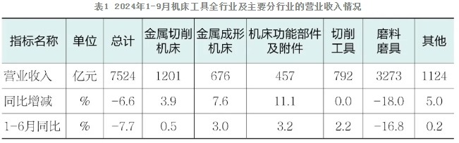 2024年1-9月,機床工具全行業(yè)完成營業(yè)收入7524億元,同比下降6.6%,降幅較1-6月收窄1.1個百分點。其中,金屬切削機床同比增長3.9%,增幅較1-6月擴大3.4個百分點;金屬成形機床同比增長7.6%,增幅較1-6月擴大4.6個百分點;磨料磨具同比下降18.0%,降幅較1-6月擴大1.2個百分點。