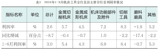 2024年1-9月,機床工具全行業(yè)平均利潤率為2.6%,同比降低8.7個百分點,較1-6月降低0.4個百分點。其中,金屬切削機床同比降低0.4個百分點,較1-6月上升0.3個百分點;金屬成形機床同比降低0.7個百分點,較1-6月上升0.2個百分點。