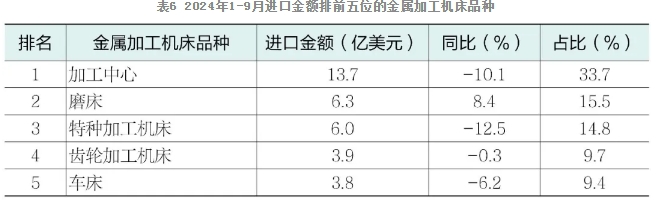 2024年1-9月進口前五位的金屬加工機床品種及其進口金額,詳見表6。