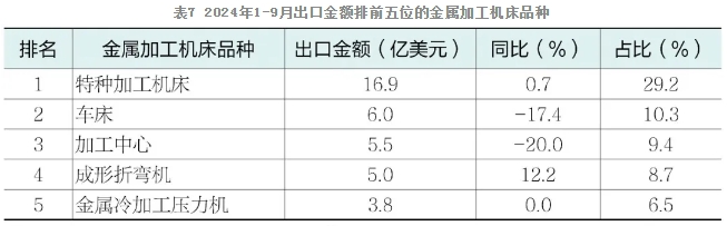 2024年1-9月出口前五位的金屬加工機床品種及其出口金額,詳見表7。
