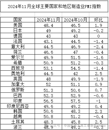 2024年11月份,歐洲制造業PMI為47%,較上月下降0.7個百分點,連續3個月在48%以下。從主要國家來看,西班牙和瑞典制造業PMI均在53%以上;英國、法國和意大利制造業PMI繼續在50%以下,且較上月均有不同程度下降;德國制造業PMI與上月持平,仍在43%低位。