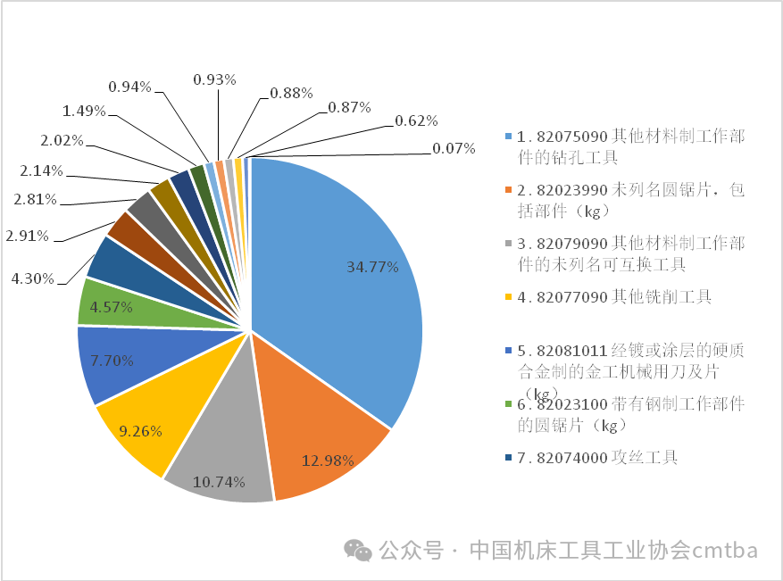 2024年刀具出口主要品種及金額分別是:鉆頭(89.18億元)、圓鋸片(45.02億元)、互換工具(27.56億元)、刀片(29.64億元)、銑刀(23.75億元)、攻絲工具(11.02億元)、超硬孔加工刀具(7.2億元)、超硬互換工具(5.49億元)、雙金屬帶鋸條(5.18億元)。