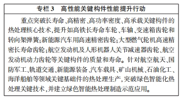 圍繞航空航天裝備、先進軌道交通裝備、高檔數控機床、石油化工裝備、船舶裝備、新能源裝備等領域發展需求,重點突破時速 350 km 以上高速鐵路軸承、高精機床主軸軸承、航空發動機軸承等長壽命高可靠性軸承,小型機器人、無人機用精密軸承,精度保持性達 6000 h 以上的高精度滾動絲杠、導軌,20 MW 及以上風力發電機組大型關鍵齒輪、齒圈,百萬千瓦級核電反應堆壓力容器用緊固件,高鐵長壽命車輪、車軸、變速箱齒輪和轉向架彈簧,4000 噸及以上履帶起重機減速器齒輪,大型艦船高速柴油機用曲軸等關鍵零部件的高性能化熱處理,形成重大裝備關鍵零部件熱處理穩定生產制造能力。